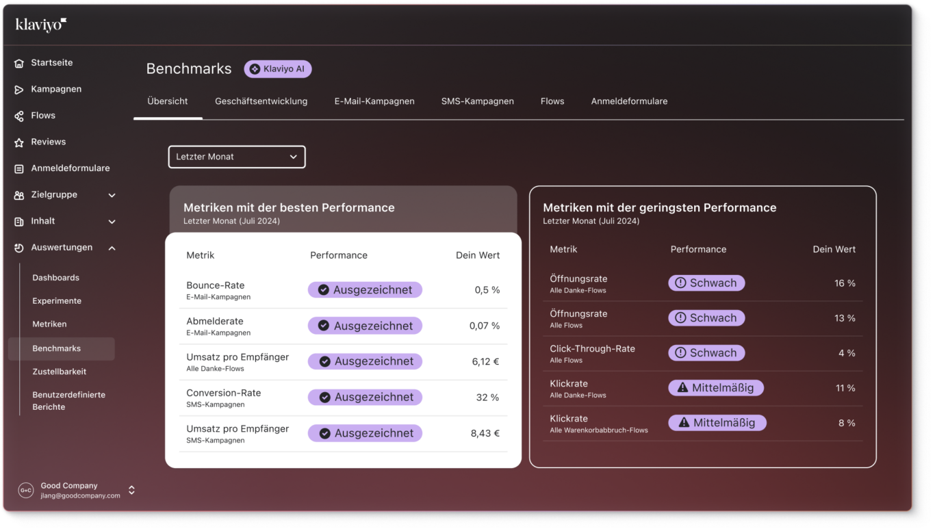 Klaviyo-Benchmarks werden automatisch an deine Branche sowie deine Positionierung in der Branche angepasst.