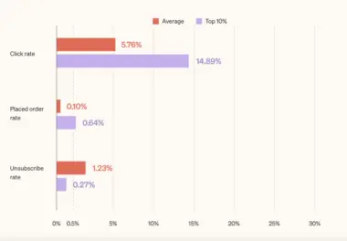 Dig into Klaviyo’s SMS marketing performance data to see where you stand on email click rates, conversion rates, revenue per recipient, and unsubscribe rates in comparison to your industry’s average.
