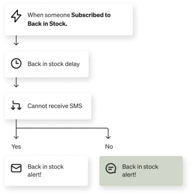Back-in-stock flows automatically notify people who specifically subscribe to updates for when a particular product is back in stock. Sending these contacts an SMS message in addition to an email can help increase conversion rates because of the time-sensitive nature.