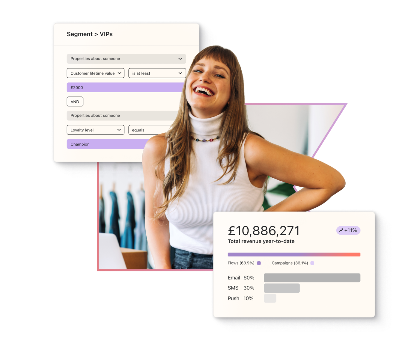 Deliver seamless experiences across email, SMS, mobile push, and reviews throughout the customer journey, so you can send fewer messages but earn even more.